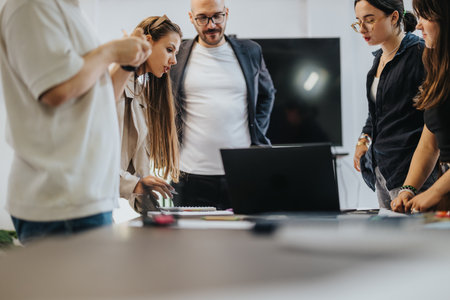 A diverse team collaborates around a laptop in an office. They discuss strategies, share insights, and demonstrate teamwork in a professional environment.