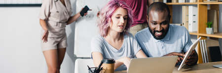 Horizontal concept of multicultural business people using laptop and digital tablet in office