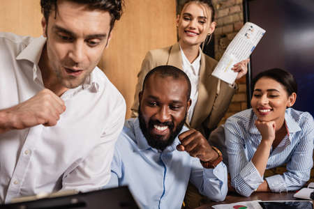 excited multiethnic business colleagues showing win gesture on blurred foreground