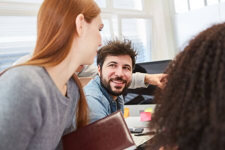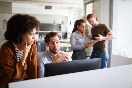 Successful business team watching content on computer monitor together, discussing project, sitting at workplace and pointing at display. Business communication or teamwork concept