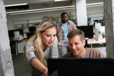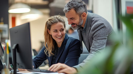 Two colleagues engage in a productive exchange at a modern desk. The woman types with a smile while her male counterpart gestures at the screen, fostering teamwork and innovation.