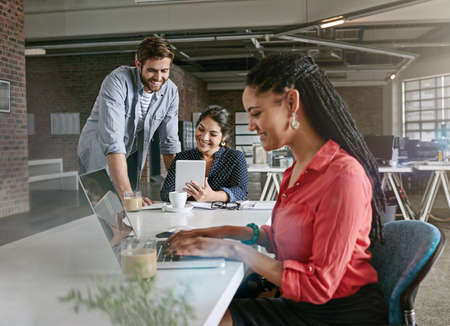 Digital discussions in action. Shot of a group of colleagues working on a laptop in an office.