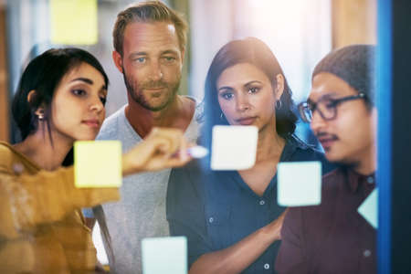Forming the best strategy together. Shot of a group of businesspeople brainstorming with notes on a glass wall in an office.