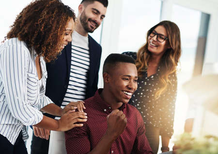 Cheerful group of creative business people winning great successful stretegy achievement in meeting room office background
