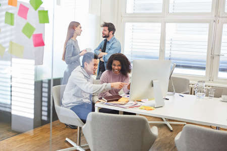 Celebrating success. Happy multiracial business people giving high five to each other and smiling while working together in the modern coworking space