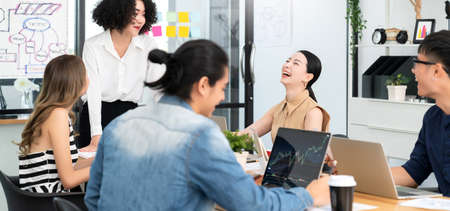 Group of asian young creative happy people entrepreneur on a business meeting office background Good leadership and teamwork lead to success
