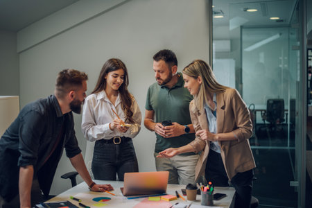 Group of colleagues gathered in the office having fun during brainstorming while discussing new ideas for their new project. Office coworkers gather in boardroom exchanging ideas at briefing.