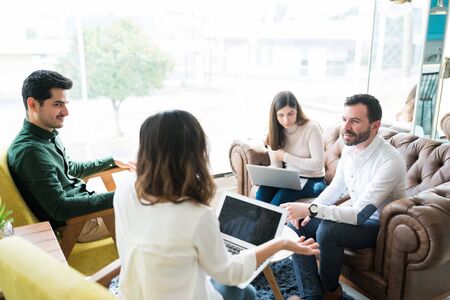 Group of a young business people discussing business plan at modern startup office building
