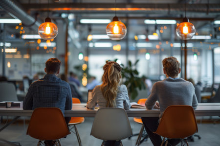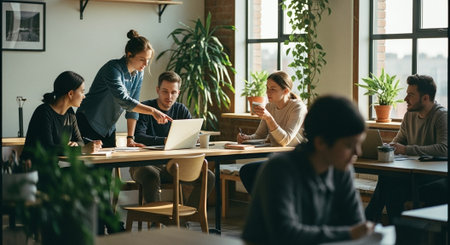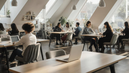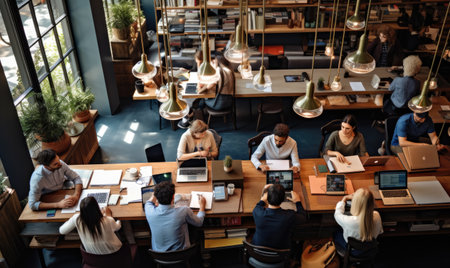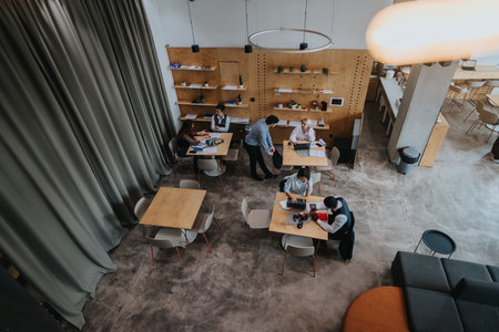 A gathering of individuals sitting at tables inside a restaurant, engaging in conversations while enjoying their meals, Shared coworking space filled with entrepreneurs, AI Generated