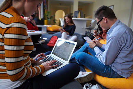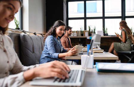 Group of young business people working together in modern office. Selective focus.
