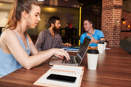 Serious young businesswoman sitting at big table in cafe and working on computer when her coworker discussing project details in background