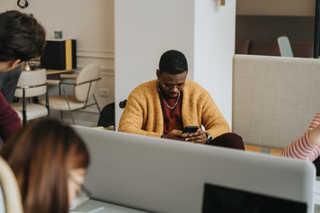 Front view of a Caucasian men working in a modern office, taking a brak and resting, lying on a bean bag, using a smartphone, with other colleagues working in the background.