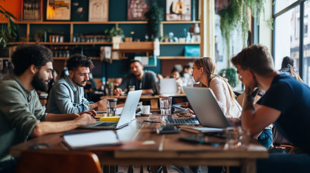 A diverse group of individuals engaged in collaborative work, seated at tables with laptops, Rustic coffee shop with freelancers on laptops, AI Generated