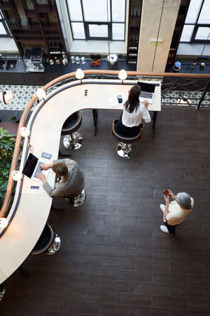 Group of young business people working together in a modern coffee shop.