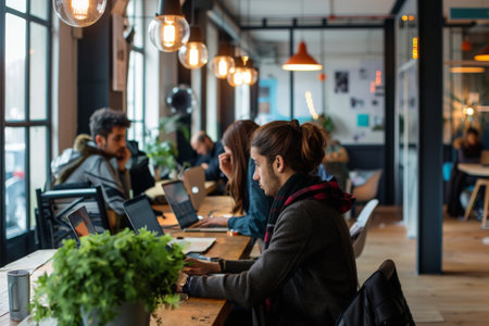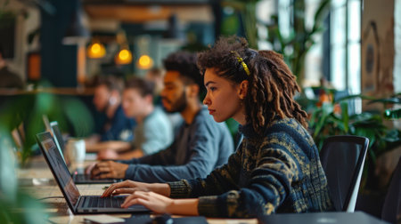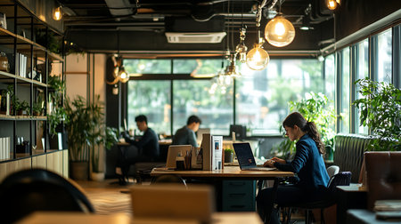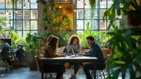A modern co-working space bustling with professionals working on laptops surrounded by green indoor plants and natural light. AIG41
