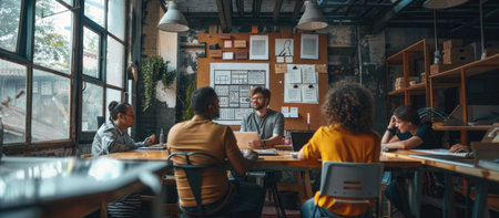 Creative professionals collaborate at a modern coworking space during the day