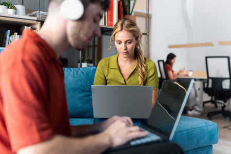 Shot of business people working with laptop while sitting on a couch in a coworking place