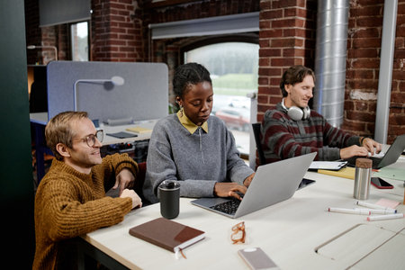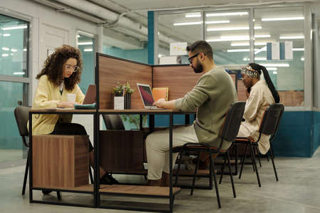 Group of young intercultural coworkers sitting by their workplaces in openspace office and analyzing online information
