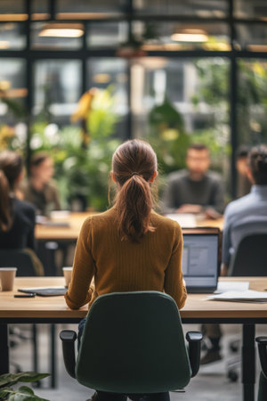 Back view of businesswoman leading team meeting, sitting at table in conference hall in office. Concept of teamwork and leadership