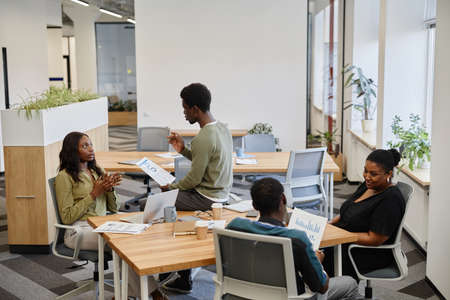 Young African American woman at the office with multiracial coworkers discuss business strategy. Vertical. Copy space.