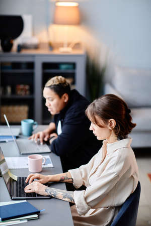 Vertical side view portrait of two women using computers at home workplace together