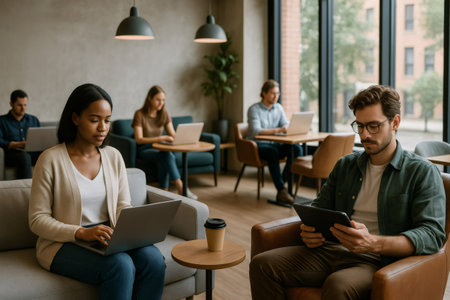 Business colleagues collaborating and utilizing technology in a bright, comfortable workspace designed for productivity and teamwork