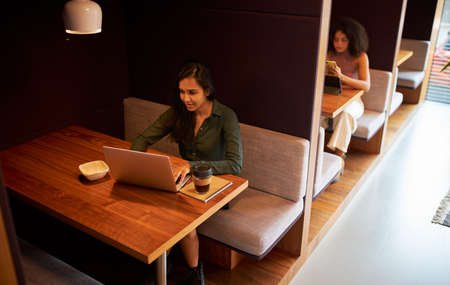 Businesswomen Working In Socially Distanced Cubicles In Modern Office During Health Pandemic