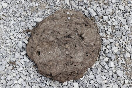 Fresh elephant dung on a gravel road in a national park with living organisms and dung beetles