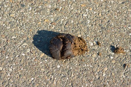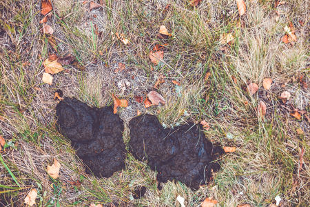 Pile of fresh horse droppings or manure on a forest pathway. Low angle shot, autumn morning, no people.