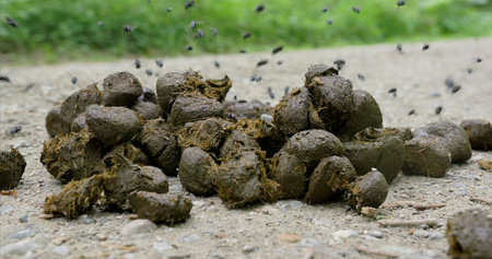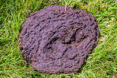 Fresh Buffalo or Cow dung for fertilizer in nature. Cow shit dung in the meadow field green grass outdoor.