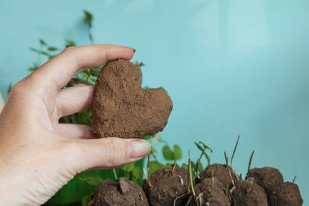 Make Seed Balls. Hearts of Green. Woman is holding fresh produced Seed Balls or Seed Bombs on blue background. Copy space