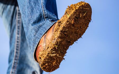 Excrement of a cow in a cattle farm, dung, on a meadow.