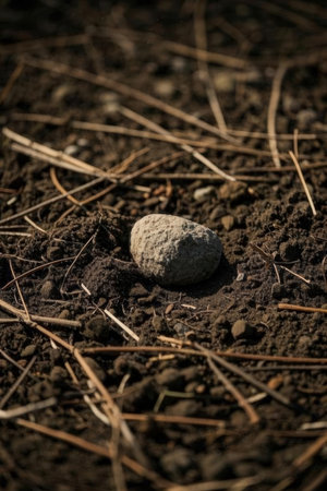 A close-up captures a pile of animal excrement resting on dry, cracked earth. The image presents a color palette of browns and yellows, with a shallow depth of field. The sunlight bathes the scene, highlighting the textures of the ground. This image could serve various commercial or educational purposes.