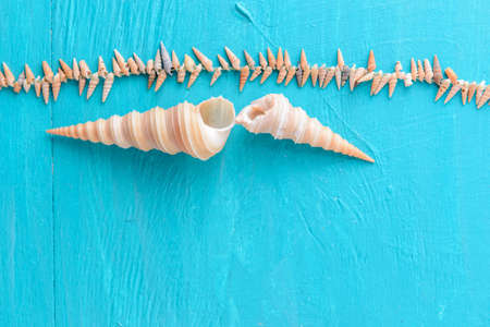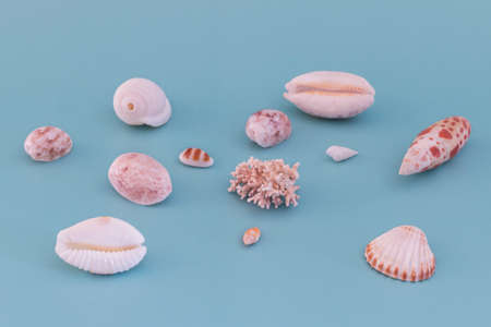 Beautiful seashells lie in a row on the left side of the frame on a blue background. Space for copy.