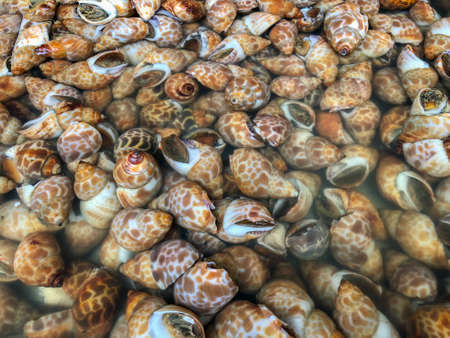 Babylonia areolata’s a species of sea snail in the family Babyloniidae, phylum mollusca, superfamily muricoidea. Fresh sea snails in sea water in stainless tray to sell as seafood usually to grilled