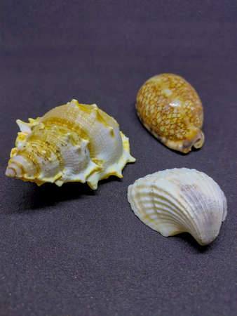 Still life of shells of different sizes on a decorative background