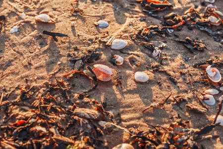Small shells on sea sand in sunset light