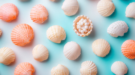 A variety of seashells in soft pastel colors are scattered on a light blue surface, with one shell displaying delicate white pearls at its center.