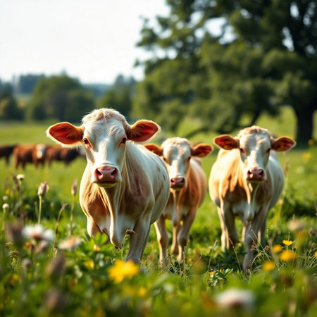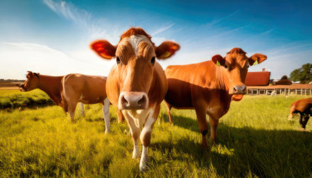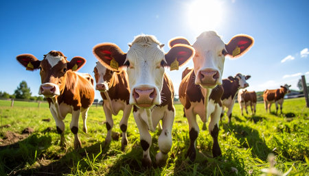 A friendly herd of curious dairy cows gathers in a lush green pasture on a bright, sunny day. Bathed in warm sunlight, they look directly into the camera, embodying a sense of peace, natural living, and the wholesome spirit of the countryside.