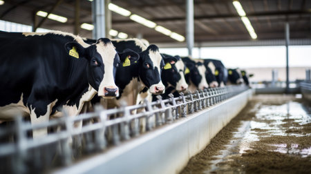 Cows in cow milking facility. Farm dairy and milk production livestock industry. Generative Ai