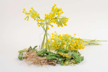 Fresh cowslip, Primula veris, flowers and dried root, leaf, flower of cowslip for tea.