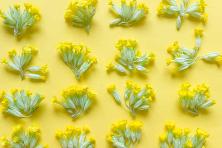 Creative natural pattern with yellow primula flowers on yellow background.