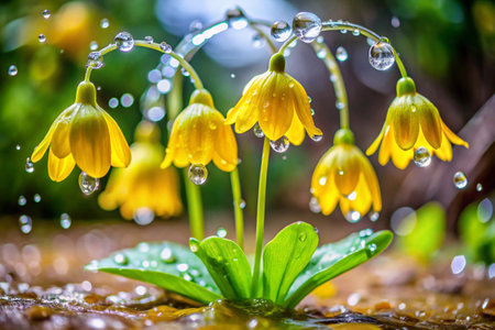 Yellow spring flowers with water drops after rain in the forest, close-up