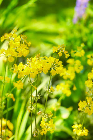 yellow rape turnip flowers in macro closeup, blooming field mustard plant during spring season, nature background