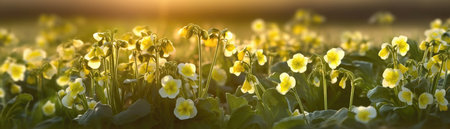 Delicate yellow primrose flowers emerge from lush green foliage in a sun-drenched meadow, with a soft, blurred...