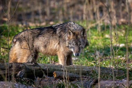 Wolf in the forest up close. Wildlife scene from winter nature. Wild animal in the natural habitat