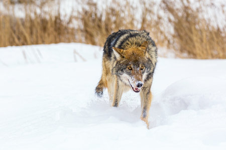Timber wolf with snow outdoors in winter. European wolf Canis Lupus in natural habitat. wild life