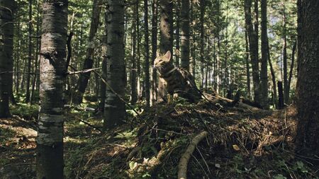 One cat in a city park. Bengal wildcat walk on the forest in collar. Asian Jungle Cat or Swamp or Reed. Domesticated leopard cat hiding, hunting and playing in grass. Domestic cat in outdoor nature.