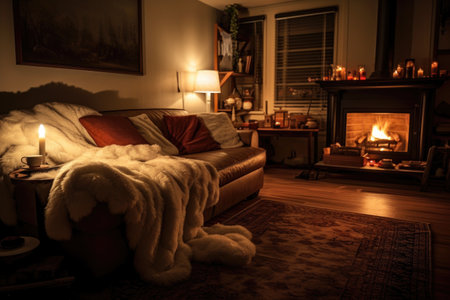 cozy candlelit living room with a fluffy rug, created with generative ai