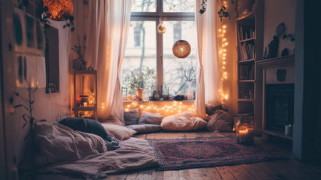 A cozy bohemian living space filled with soft cushions, warm ambient lighting, and natural elements. Ideal for relaxation and leisure, this inviting setting features a window view and decorative accents that create a peaceful atmosphere.